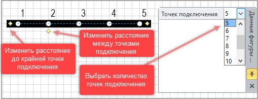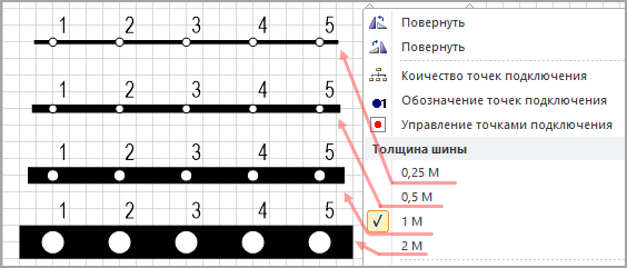Для символов шин, в контекстном меню фигуры, можно открыть окно Данные фигуры для изменения числа точек подключения, скрыть или показать обозначение точек подключения, скрыть неиспользуемые точки подключения выбрав пункт меню Управление точками подключения, изменить толщину шины